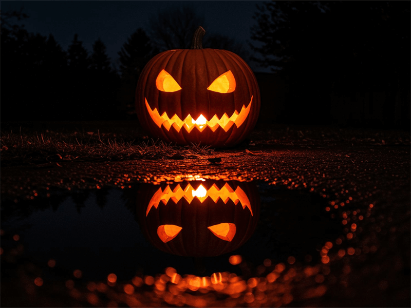 فانوس جک او لایت روشن که شب هنگام با پس زمینه تاریک در یک محیط بیرونی در گودال آب منعکس می شود