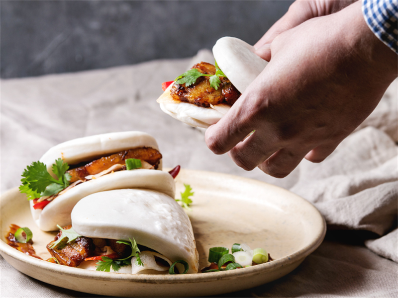 گوا بائو (نان بخارپز)** گوا بائو که در زبان تایوانی با نام «ببر خوک را گاز میگیرد» نیز شناخته میشود، تلفظی شبیه به «شانس خوب تو را گاز میگیرد» دارد و نماد بلعیدن تمام بدشانسیهای سال گذشته است تا در سال جدید بخت و اقبال خوب به سراغت بیاید! گوا بائو که با مواد مختلف پر شده، شبیه یک کیف پول بزرگ و گرد است و بنابراین پس از خوردن، معنای فرخنده ثروت فراوان را به همراه دارد.